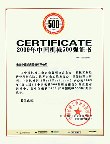 由中国机器财产企业办理协会主理,机器财产经济办理研讨院、天下企业尝试室协办,天下司理人周刊、中国机器网包办的2009年(第七届)《中国机器500强研讨报告》查问拜访勾当宣布,中德机床荣获2009年“中国机器500强”。