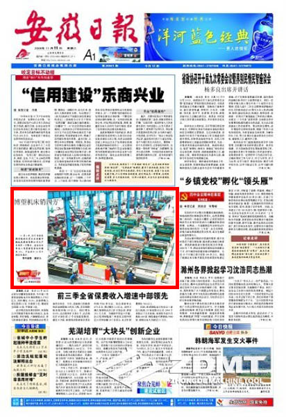 本(ben)日(2009年11月(yue)11日)《安徽日报(bao)(bao)》头(tou)版刊(kan)载《博(bo)望机床销四方》的(de)(de)图(tu)片消息(xi)报(bao)(bao)道。在我(wo)公司大型车间图(tu)片中,配出以(yi)下笔墨报(bao)(bao)道:1一(yi)月(yue)份(fen)6日,属于(yu)当涂县博(bo)望镇的(de)(de)民营行业(ye)行业(ye)河南(nan)中德数控车床股(gu)分无现司出厂車间里一(yi)篇奔波。该行业(ye)当年🌱度前三月(yue)度发卖量(liang)相比以(yi)往新增(zeng)35%,乙酰乙酸(suan)出口(kou)处(chu)30另(ling)一(yi)个地(di)(di)方和地(di)(di)理(li)环境。(特(te)约店照照照 谢(xie)富乐)